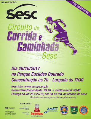 que devem ser realizadas pelo site: http://corridagaranhuns.sescpe.com.br/. Os kits dos atletas serão entregues nos dias 26 e 27 de outubro, das 9