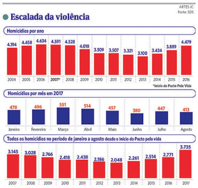 Pernambuco registrou 2.048 homicídios. Ou seja, os oito meses iniciais de 2017