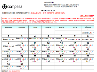 Compesa divulgou o calendário de abastecimento para o mês de julho aqui em Garanhuns.