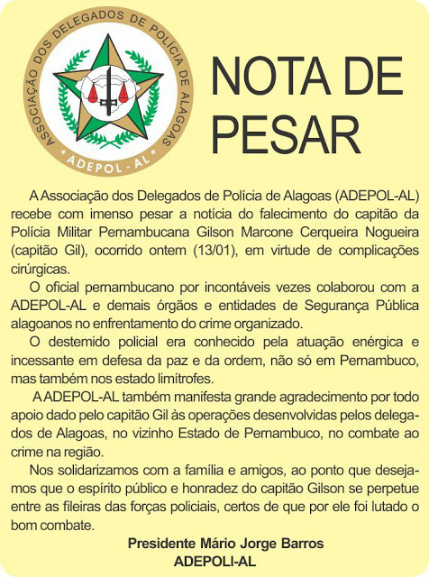 do Capitão PM Gilson Marcone Cerqueira Nogueira, o popular Capitão Gil, ocorrido na tarde de hoje, dia