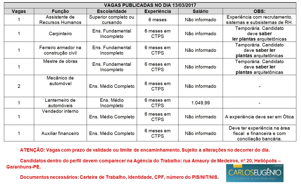 disponíveis até hoje, dia 13, porém estão sujeitas a alterações no decorrer do dia. É necessário levar a Carteira de Trabalho, Identidade, CPF, número do PIS/