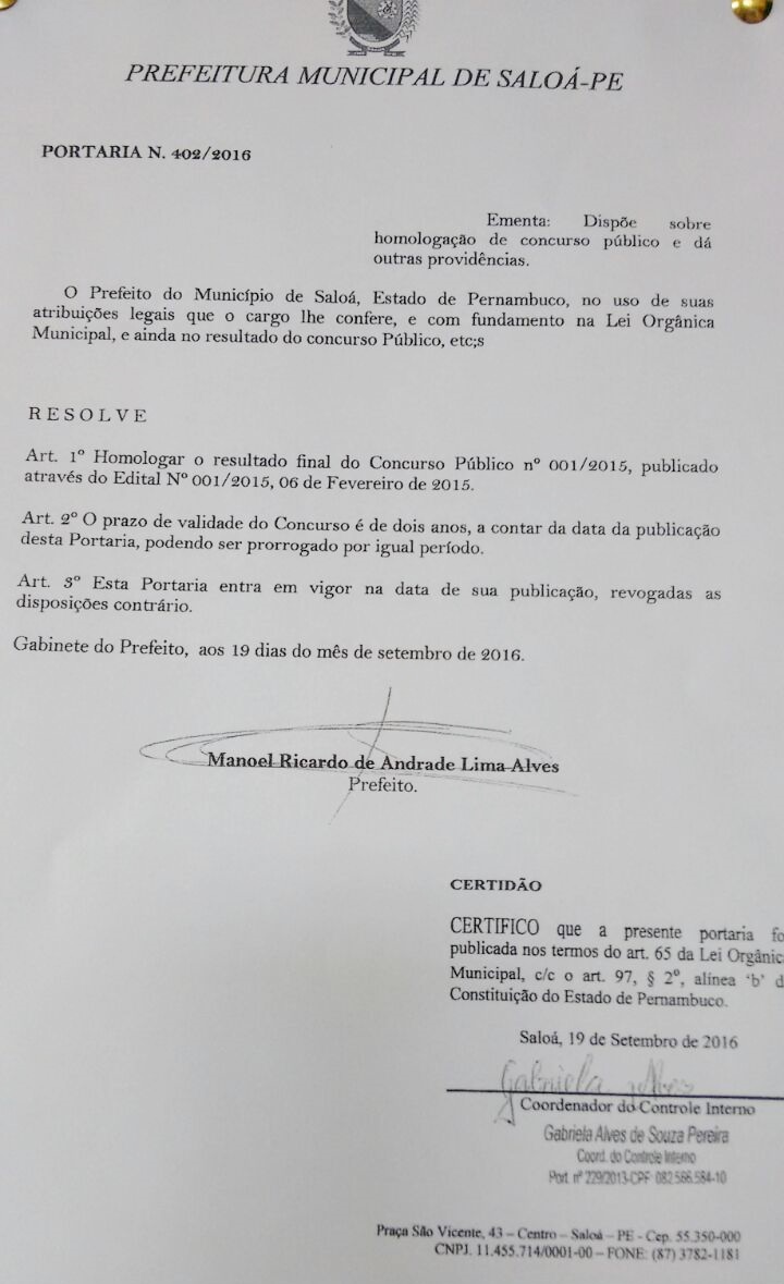 Público e a Justiça. “Com a homologação do Concurso por parte do Gestor