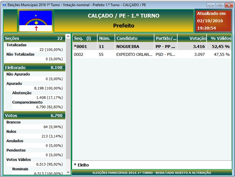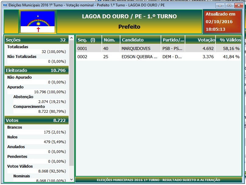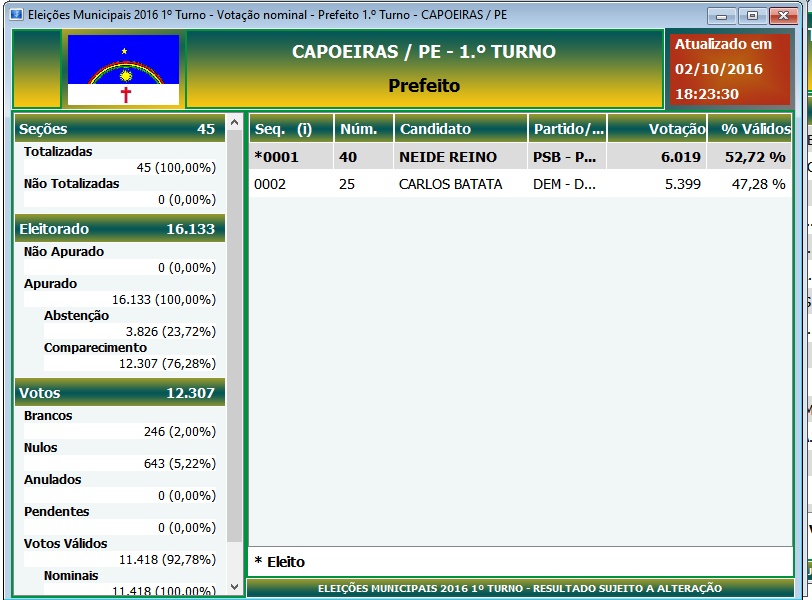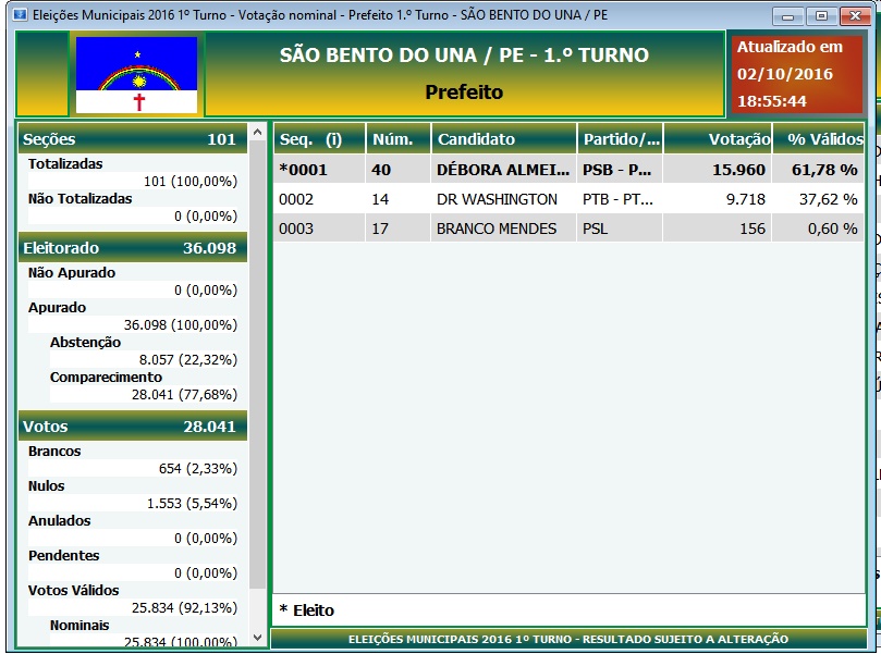 1.645 (2,55%) e Valter Couto 654 (1,01%) completam a votação.