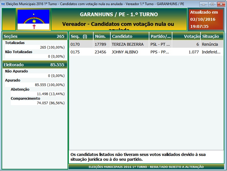Garanhuns. Vale registrar que o candidato Johny Albino teve 1.077 votos.