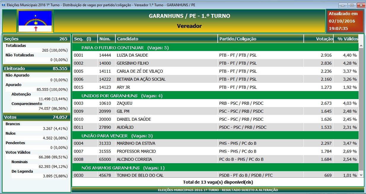 previsão é que a totalização dos votos em Garanhuns seja concluída até as 19h. Tanto a totalização, quanto a diplomação dos eleitos ficará a cargo da 56ª Zona Eleitoral. Vale salientar que Garanhuns