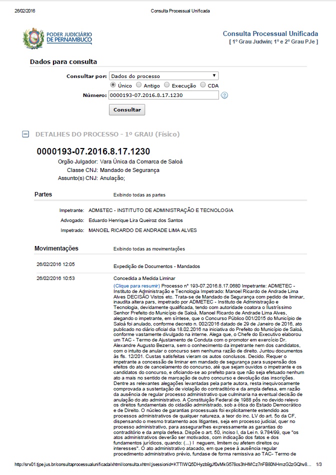 pelo Prefeito Ricardo Alves em caso de descumprimento da Decisão Judicial. O Concurso da Prefeitura de Saloá foi