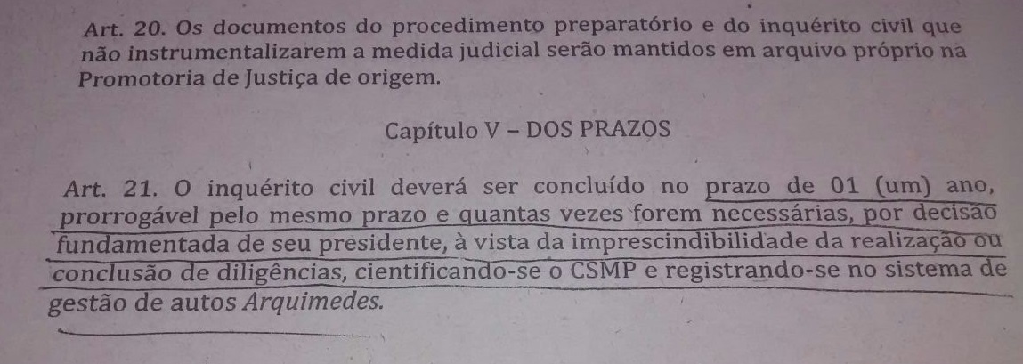 Civil, prevê em seu artigo nº 21, que “o inquérito civil deverá ser concluído