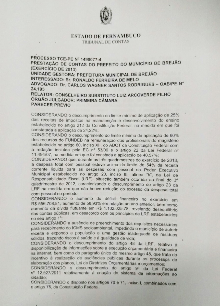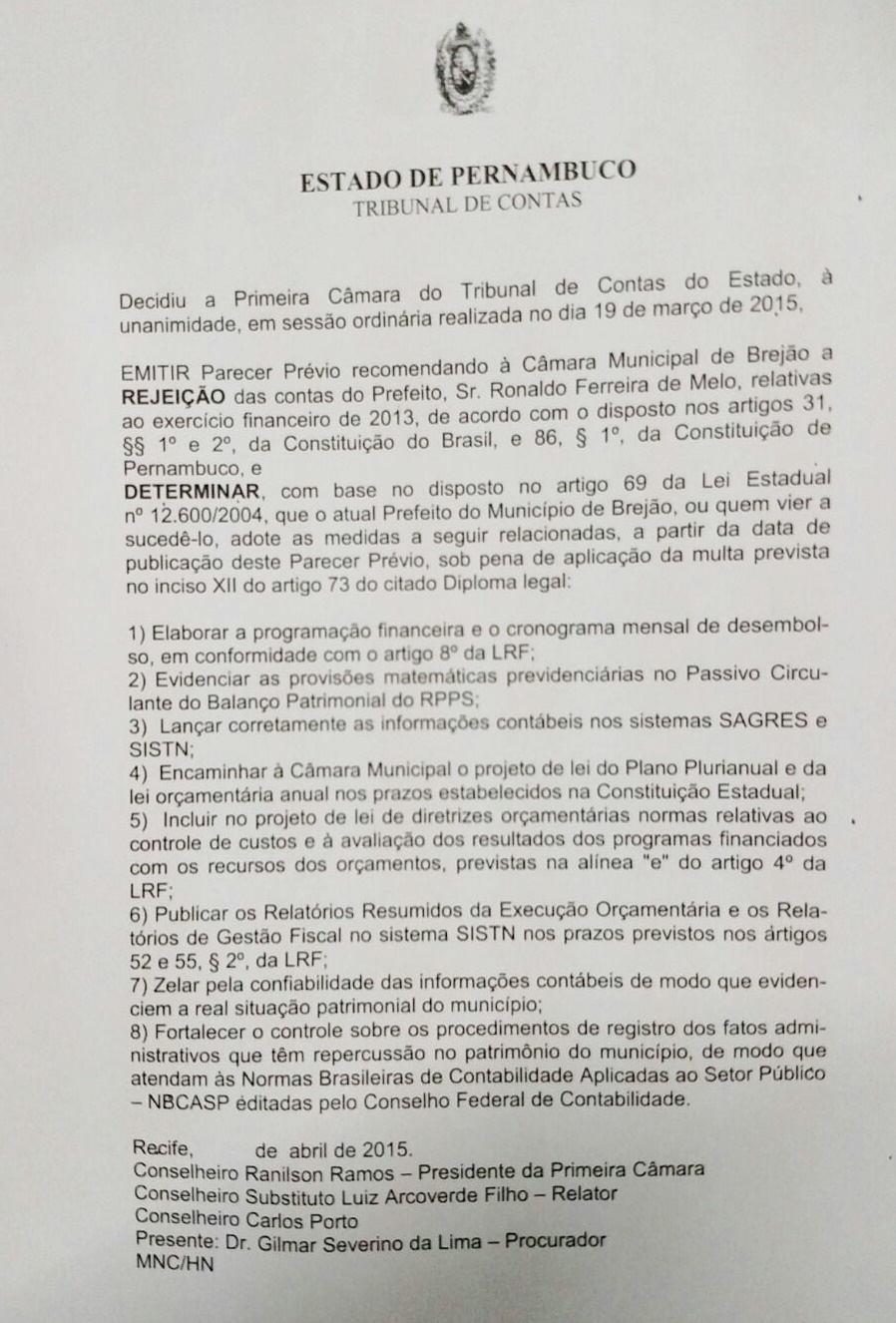 Clique AQUI para acessar o Relatório do TCE sobre as Contas da Prefeitura de Brejão.