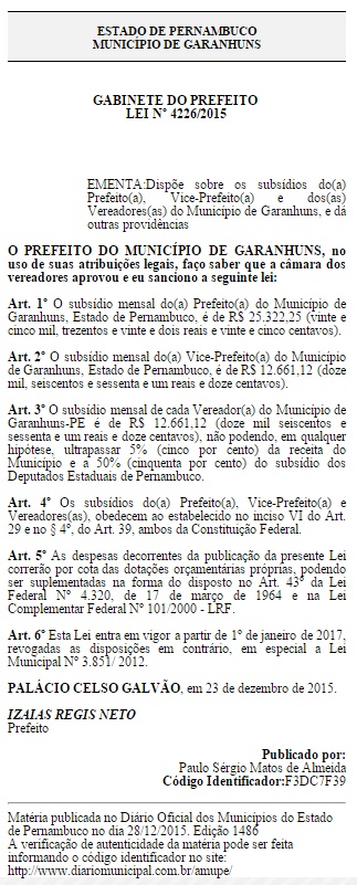 nos salários do Prefeito, Vice-prefeito e Vereadores de Garanhuns, sancionado
