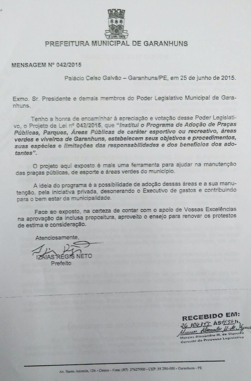 na Cidade. É que o Prefeito Izaías Régis (PTB) encaminhou ao Legislativo