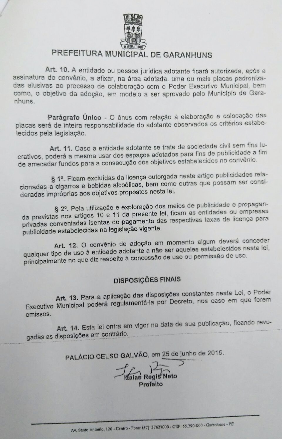 está à disposição da Prefeitura e da Câmara de Vereadores para possíveis esclarecimentos