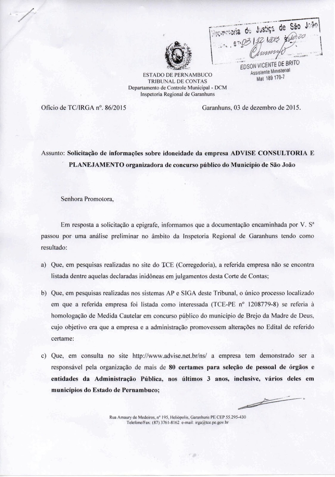 da Promotoria daquele Município, após receber parecer do Tribunal de Contas de