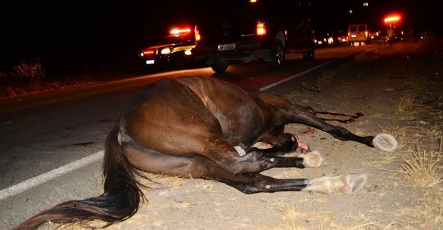 pessoas, colidiu violentamente com um cavalo, que estava no meio da rodovia. O