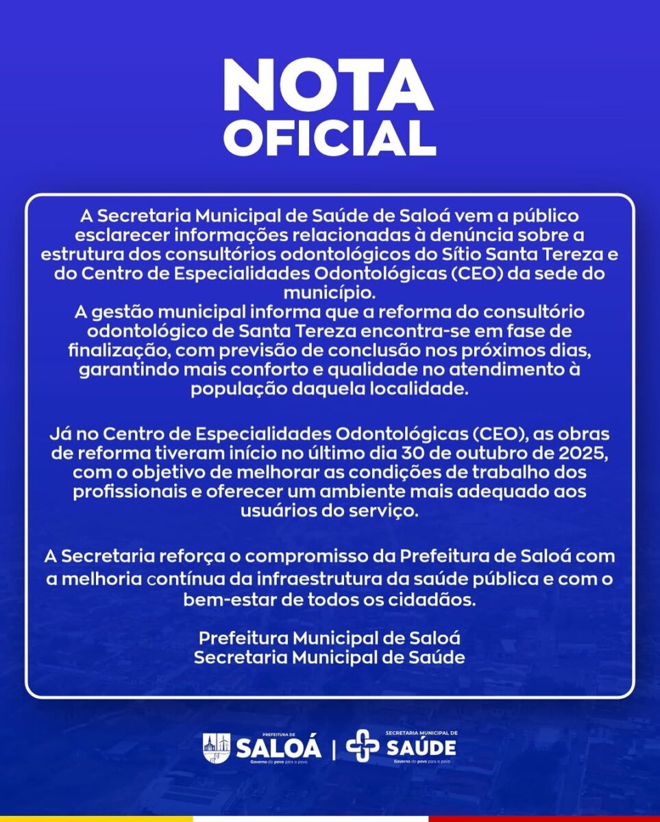 A POSIÇÃO DA PREFEITURA – Em Nota enviada ao Blog do Carlos Eugênio, a Secretaria de Saúde informou que “a reforma do consultório odontológico de Santa Tereza encontra-se em fase de finalização, com previsão de conclusão nos próximos dias, garantindo mais conforto e qualidade no atendimento à população daquela localidade. Já no Centro de Especialidades Odontológicas (CEO), as obras de reforma tiveram início no último dia 30 de outubro de 2025, com o objetivo de melhorar as condições de trabalho dos profissionais e oferecer um ambiente mais adequado aos usuários do serviço”. A Nota na ìntegra pode ser conferida na imagem acima. (@blogcarloseugenio, com informações e imagens do CRO-PE)