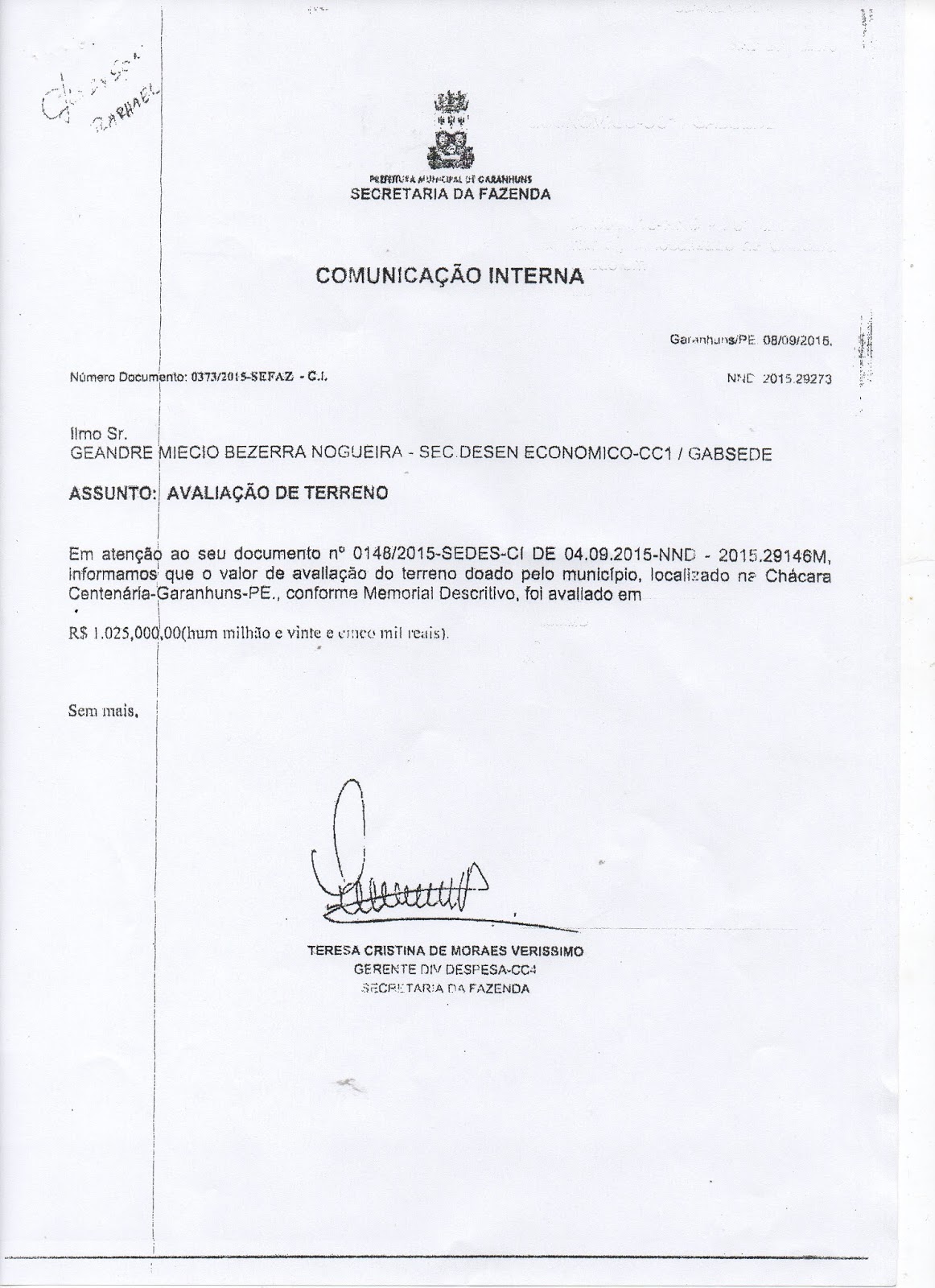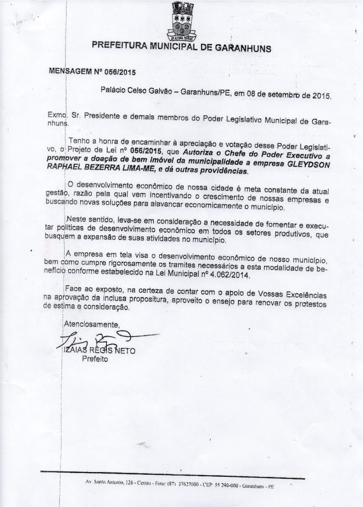 parte do Prefeito Izaías Régis (PTB), para um Empresário local, que é filho do