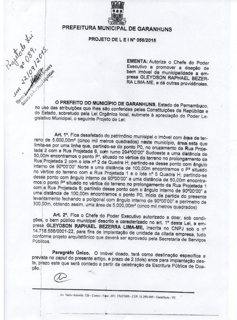 (PTB) enviou a Câmara de Vereadores de Garanhuns o Projeto de Lei nº 089/2015,