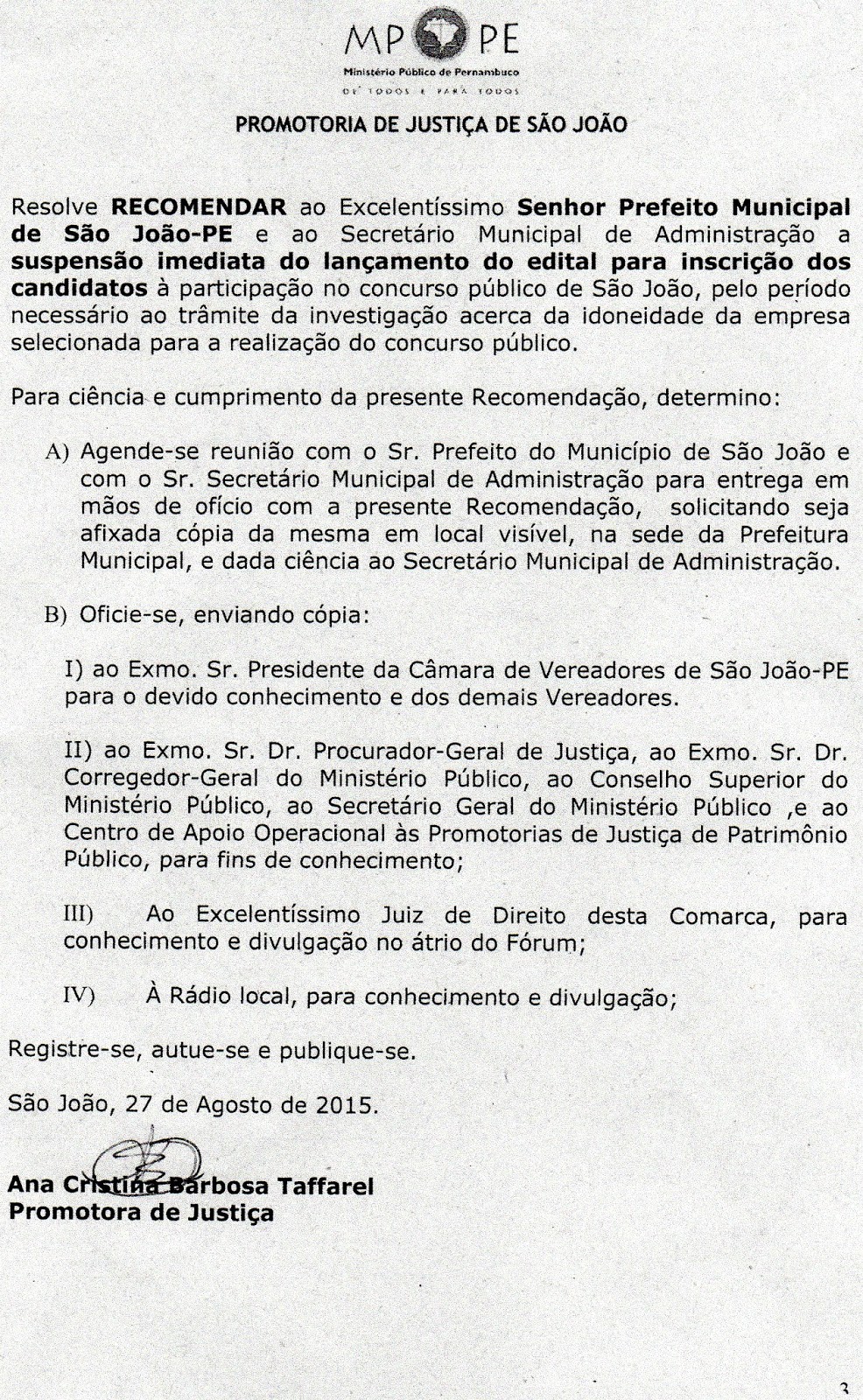 uma recomendação do Ministério Público de Pernambuco, através da Promotoria de