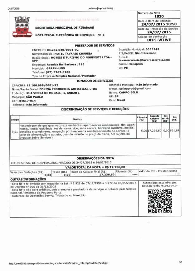 conforme notas e recibos, da Empresa Colina Produções Artísticas LTDA – Show de