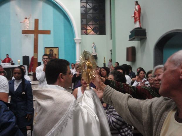 do Santíssimo, um momento de adoração em que as pessoas tocam e se sentem
