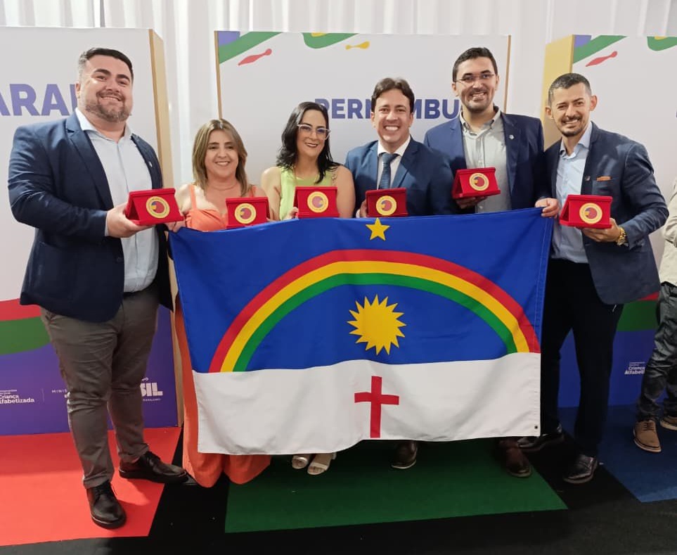 A Prefeita de Jupi, Rivanda Freire, recebeu nessa segunda-feira, dia 23, em Brasília, o Selo Ouro Compromisso com a Alfabetização 2026, reconhecimento concedido a Municípios que apresentam avanços concretos na educação básica. A cerimônia contou também com a presença da secretária Municipal de Educação, Fátima Correia.