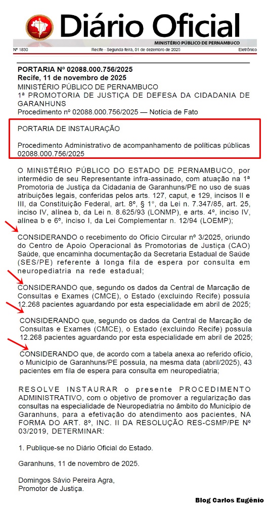 FILA DE ESPERA POR NEUROPEDIATRIA – A segunda portaria, referente ao Procedimento nº 02088.000.756/2025, trata da fila de espera para consultas com Neuropediatra. Documentos enviados ao MPPE pela Secretaria Estadual de Saúde apontam que, em abril de 2025, Garanhuns tinha 43 pacientes aguardando atendimento na especialidade.