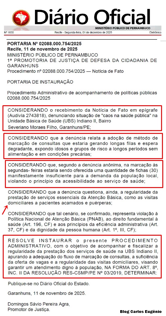 O Ministério Público de Pernambuco (MPPE), por meio da 1ª Promotoria de Justiça de Defesa da Cidadania de Garanhuns, instaurou dois procedimentos administrativos para investigar possíveis falhas na prestação de serviços de saúde no Município. As portarias foram publicadas na edição desta segunda-feira, dia 1º, do Diário Oficial do MPPE e são assinadas pelo Promotor Domingos Sávio.
