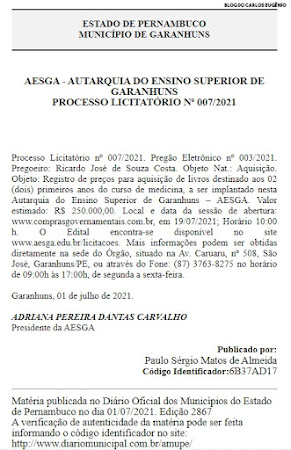 Oficial dos Municípios de Pernambuco no último dia 1º, a AESGA estima investir