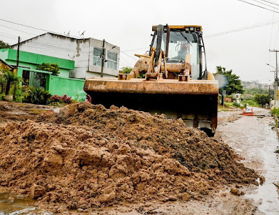 trabalhando para recuperar as ruas danificadas pela ação das chuvas no Município.