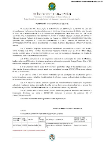 Art. 1º Aprovar a migração da Faculdade de Medicina de Garanhuns – FAMEG