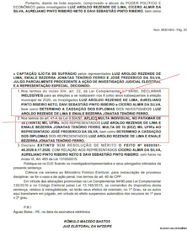 Luiz Aroldo (PT) e a Vice-prefeita Eniale Bezerra (PSD) e determinou a cassação