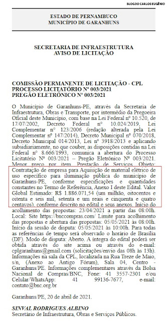 uso específico para iluminação pública do município de Garanhuns-PE, conforme