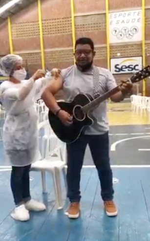 ao entoar trecho da canção “Tudo é do Pai” no momento em que foi vacinado no Ginásio