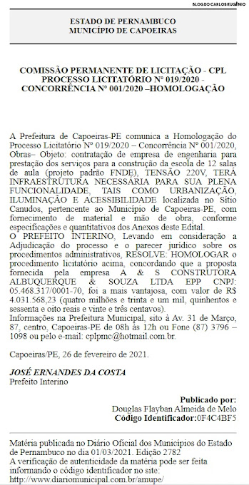 Oficial dos Municípios de Pernambuco do último dia 1º, a Prefeitura de Capoeiras