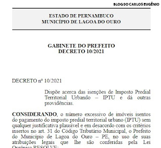 Através do Decreto nº 10/2021, o Prefeito de Lagoa do Ouro, Edson Lopes,