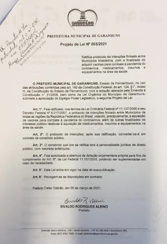 Garanhuns aprovou por unanimidade de votos na tarde de hoje, dia 10, o Projeto de Lei nº 003/2021, de