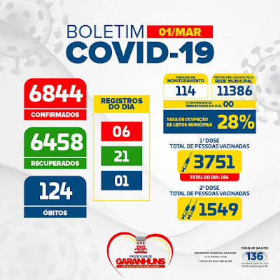 6.844 casos da COVID-19 em Garanhuns. Deste total, 124 pessoas vieram a óbito; 6.458