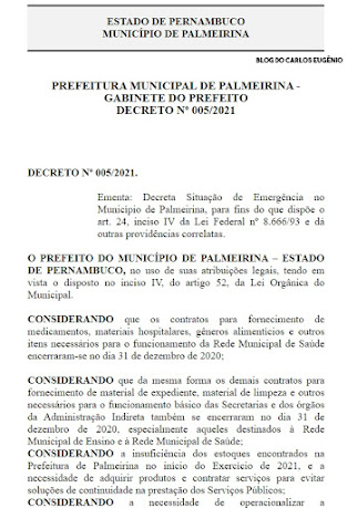 Art. 1º Fica decretada situação de emergência no Município de Palmeirina