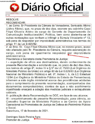 a Recomendação do Promotor Domingos Sávio e exoneraria Cayo Albino. “Vamos