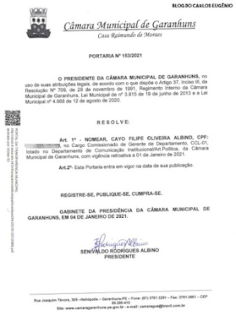 nomeações do seu filho Cayo Albino, na Câmara de Vereadores, e dos irmãos