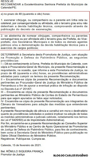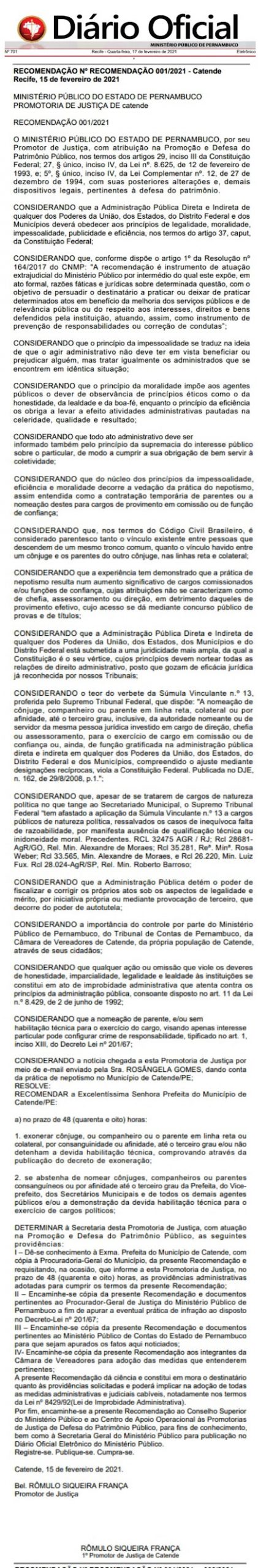 cargos políticos (Secretário). A recomendação foi publicada no Diário Oficial