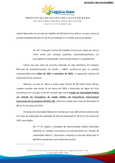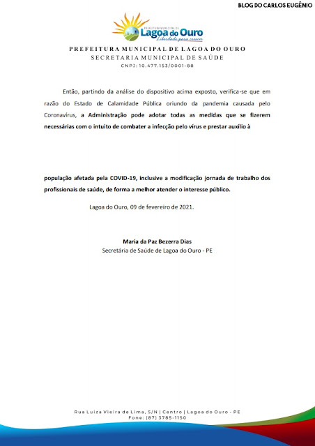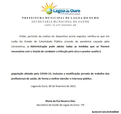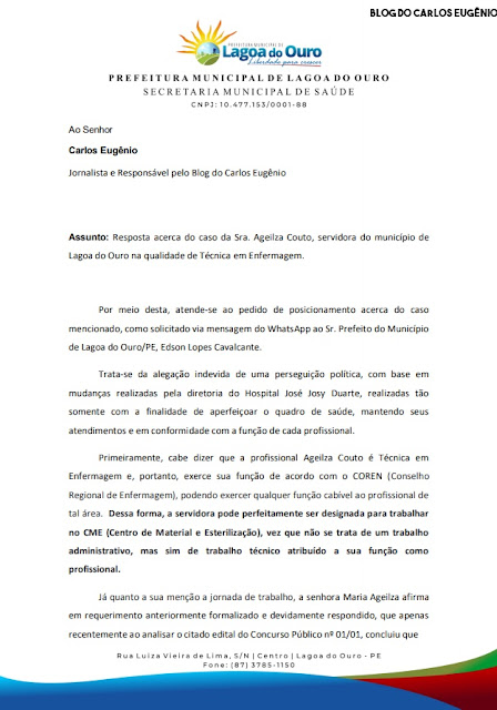 Saúde de Lagoa do Ouro, Maria da Paz Bezerra em nota enviada ao Blog do Carlos Eugênio.