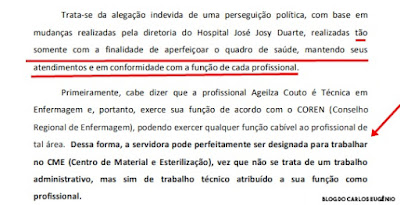 Duarte e sendo colocada para trabalhar no Centro de Material e Esterilização. Ageilza também alegou que vem sendo obrigada a fazer uma Jornada de Trabalho