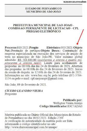 assinado pelo pregoeiro Cícero Leandro Vieira, as propostas podem ser
