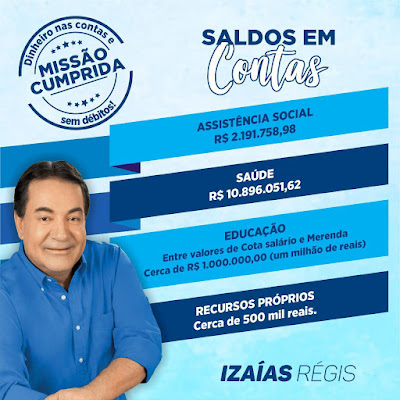 de dezembro, o ex-prefeito Izaías Régis divulgou ter deixado em conta cerca de