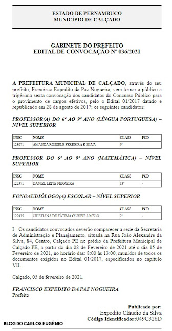 sendo convocados os candidatos Amanda Rossele Ferreira e Silva (Professora do 6º
