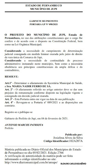 098/2021, publicada no Diário Oficial dos Municípios de Pernambuco dessa sexta-feira,
