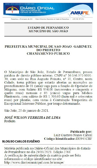 de São João fica localizada na rua Augusto Peixoto, nº 31, no Centro daquele Município. Para baixar a publicação