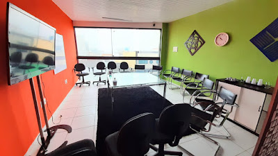 espaço para reuniões, com mobiliário, computadores, internet, telefone e