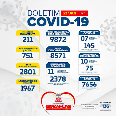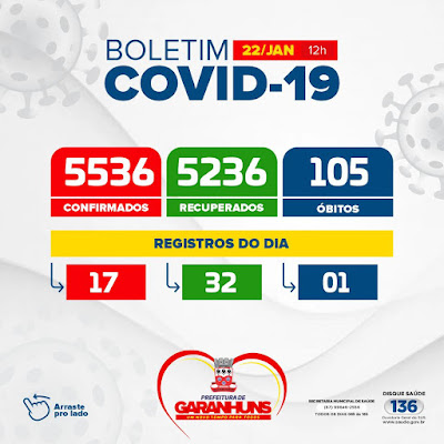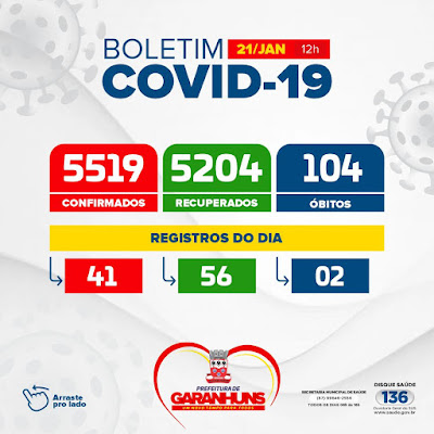 5.536 casos de COVID-19 em Garanhuns. Deste total, 105 pessoas vieram a óbito; 5.236