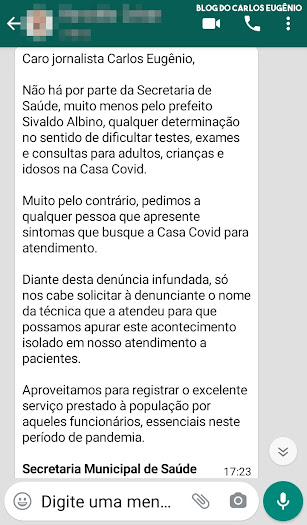 “Não há por parte da Secretaria de Saúde, muito menos pelo prefeito Sivaldo Albino, qualquer determinação no sentido de dificultar testes, exames e consultas para adultos, crianças e idosos na Casa COVID. Muito pelo contrário, pedimos a qualquer pessoa que apresente sintomas que busque a Casa COVID para atendimento. Diante desta denúncia infundada, só nos cabe solicitar à denunciante o nome da técnica que a atendeu para que possamos apurar este acontecimento isolado em nosso atendimento a pacientes. Aproveitamos para registrar o excelente serviço prestado à população por aqueles funcionários, essenciais neste período de pandemia”.
